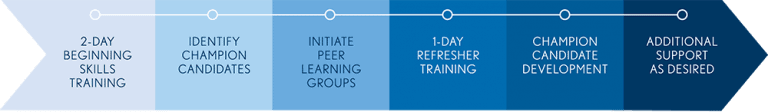 Next starts the MI Champion development phase. You’ll begin to internalize expertise within your organization to guide ongoing MI learning.